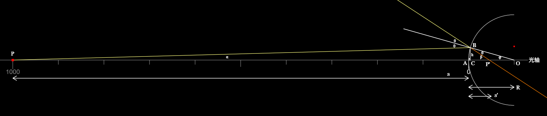 物距\(s=AP\),像距\(s'=AP'\),曲率\(R=AO\)。