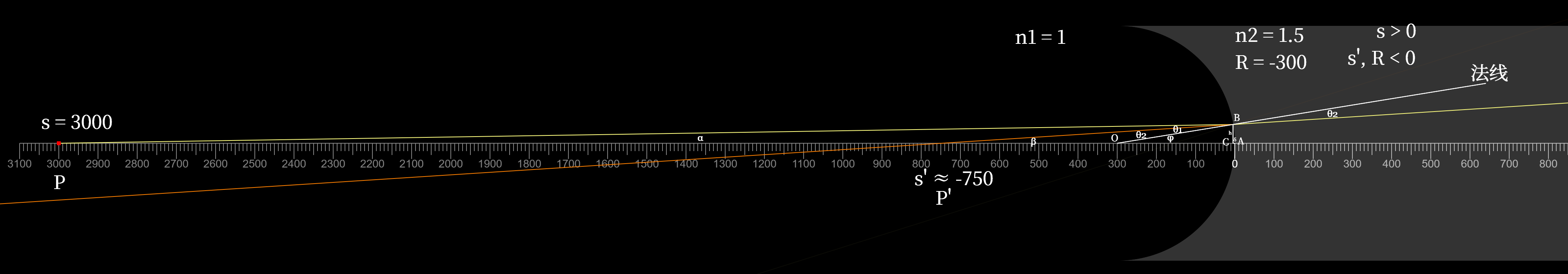 化简上式,我们将得到凹面折射时,\(s,s',R\)三者之间的数量关系